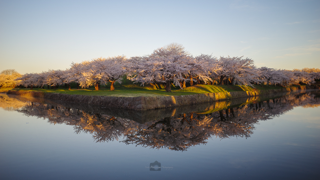 ポケットに入れていたGRで撮った、完璧な水面に映る五稜郭の桜。