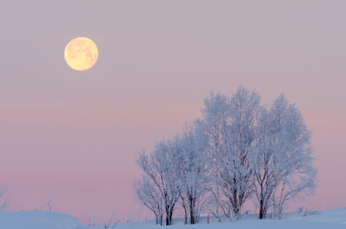 二月の満月はスノームーンと呼ばれます。この日の朝は霧氷が綺麗に咲いていました。沈む満月と霧氷の木立が極寒の夜明けの空に誇らしく映っ...